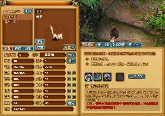 新版的界面更直观,进行各种宠物操作将更为便利。打开宠物面板,即可在【属性】、【资质】、【技能】的3个标签中进行切换即可查看宠物的具体属性。点击【强化】便可打开宠物强化界面,进行炼化、打书、化生等操作,而不必像以往那样打开紫金葫芦和宠物面板来回切换进行查看。