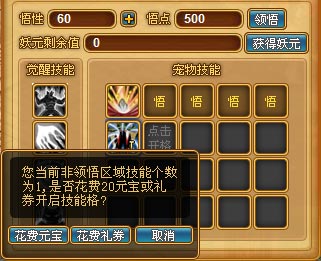 而现在,您不用再为此烦恼了!新的宠物系统中,将有5个技能格专为领悟开设,称为领悟区(图中第一行背景带“悟”字的格子)。领悟区的技能不会因化生而改变或丢失,化生获得的技能将会被放置在非领悟区内。领悟区的技能以及非领悟区的技能都可以化生给其他宠物,若化生成功,都将被放置在非领悟区。并且,想要获得更多的技能还可以使用元宝或礼券进行开格,开格后可随机获得一个低级永久绑定技能,当然每次开格的费用将会依次递增:
