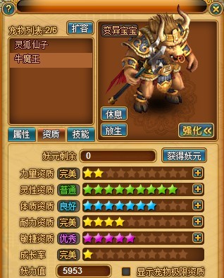 宠物的能力很大程度上取决于它的资质,而牛魔王的资质也不是一般宠物可比的。力量、耐力和成长率资质皆可达到完美品质,而耐力资质最高可达完美四星,实乃当今综合资质最强大的纯耐宠。,另外敏捷资质也可达优秀七星。虽然灵性和体质稍显不足,但是不影响它整体的强大实力,无论是攻击力还是防御力都非常之亮眼。